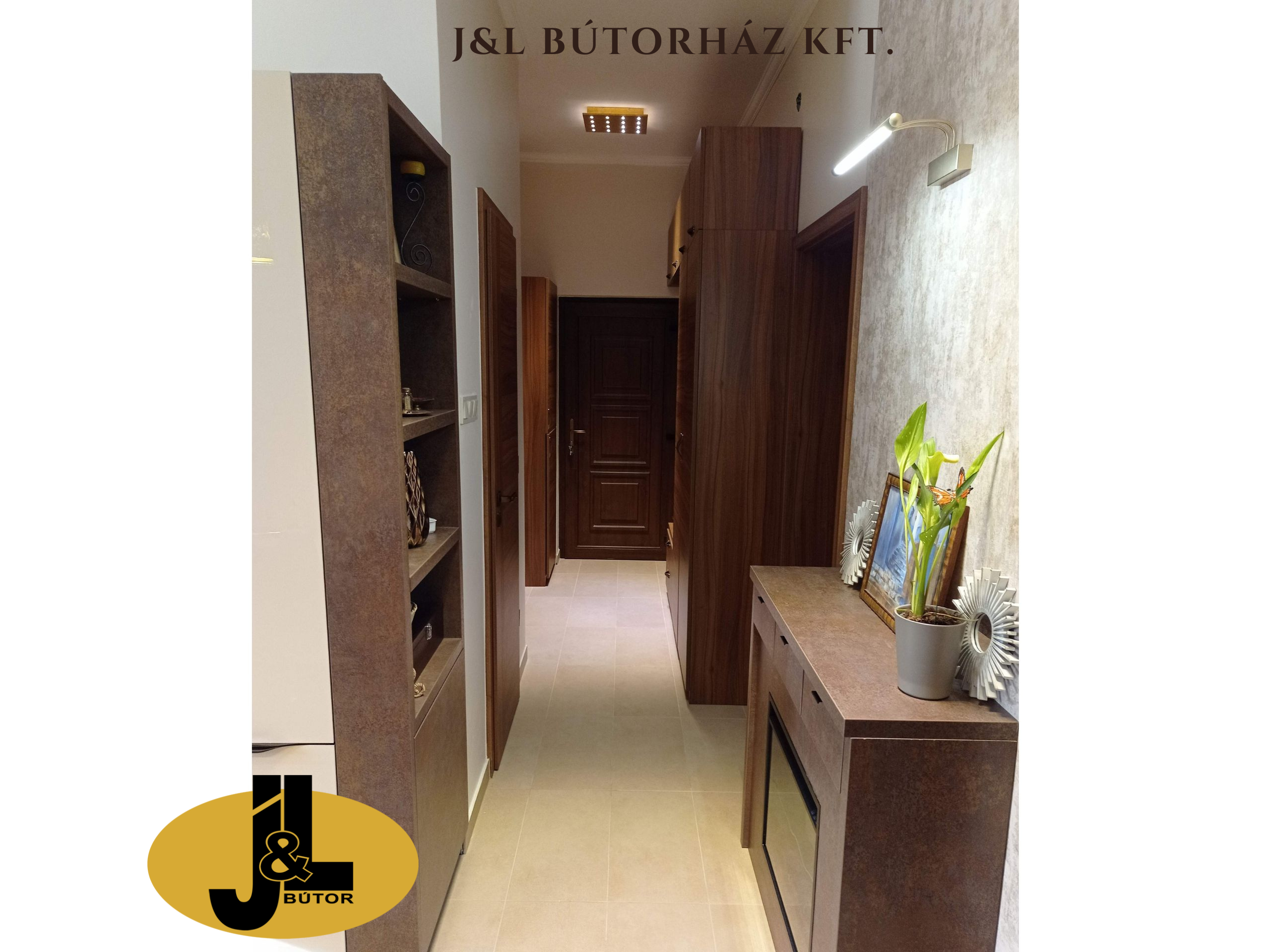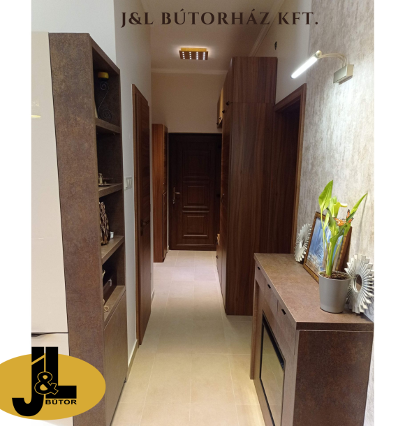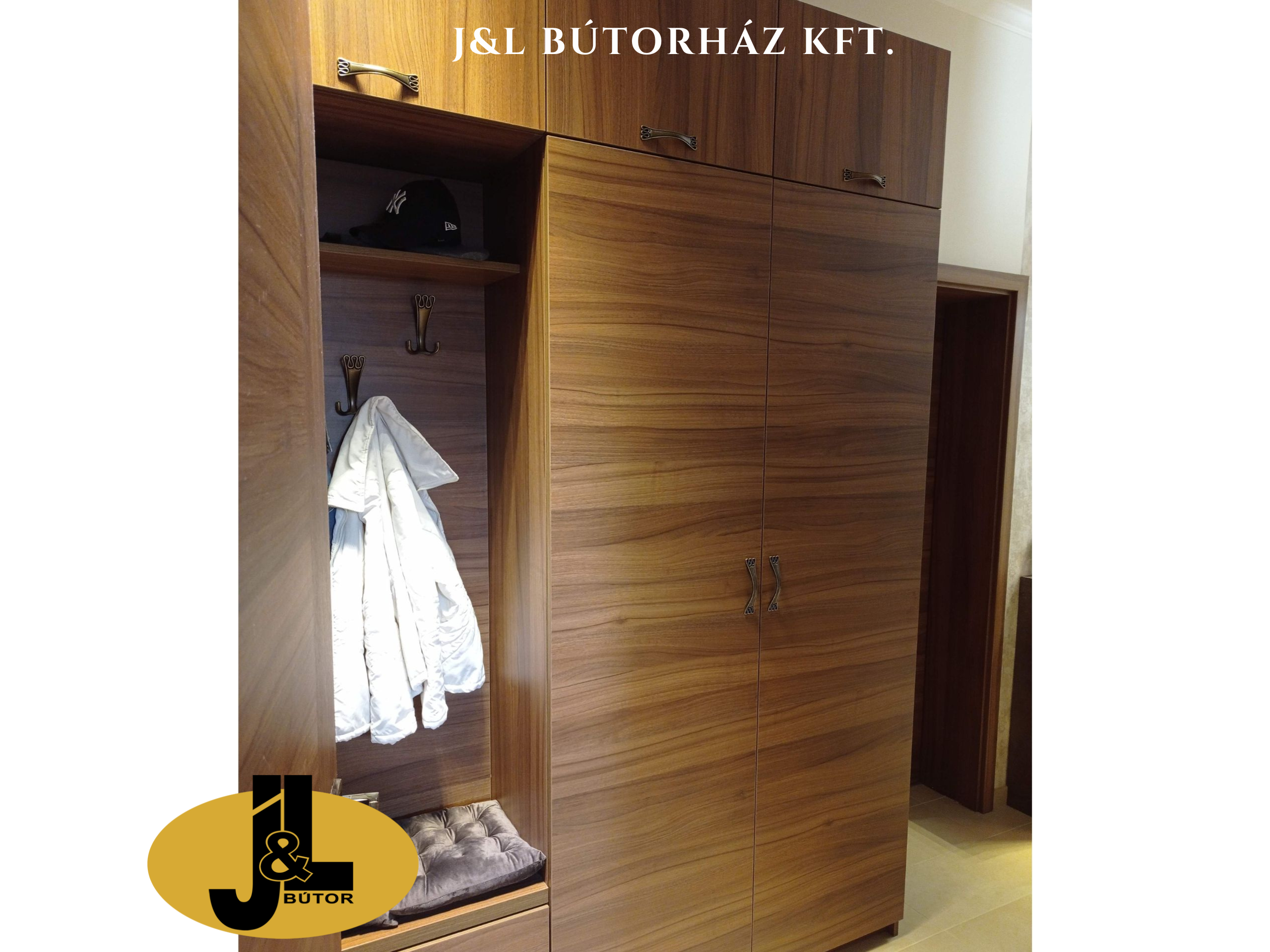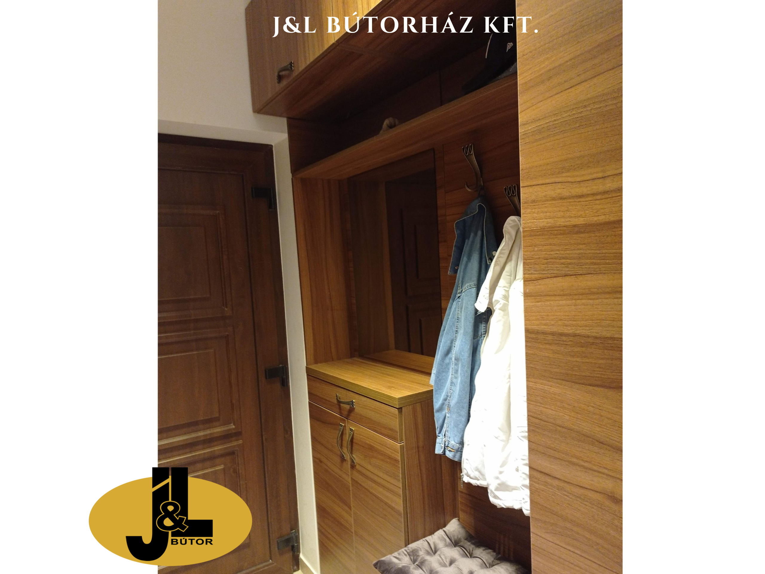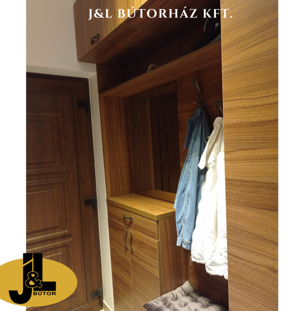 Itt fontos volt minden kis rész kihasználása, ezért bal oldalon ahol keskeny volt a fal egy cipős szekrény került kialakításra mini fiókkal, ahová a kulcsok és egyéb apró dolgok kerülhetnek. Felette tükör kapott helyett. Készült egy kis leülő alatta fiókos megoldással-felette kalaptartóval és a végén az akasztós szekrény került, belül polcokkal és trombita akasztóval. Legfelül, hogy minél több mindent elnyeljen felnyílós szekrények épültek végig, ide olyan dolgok kerülhetnek amiket ritkán használunk.