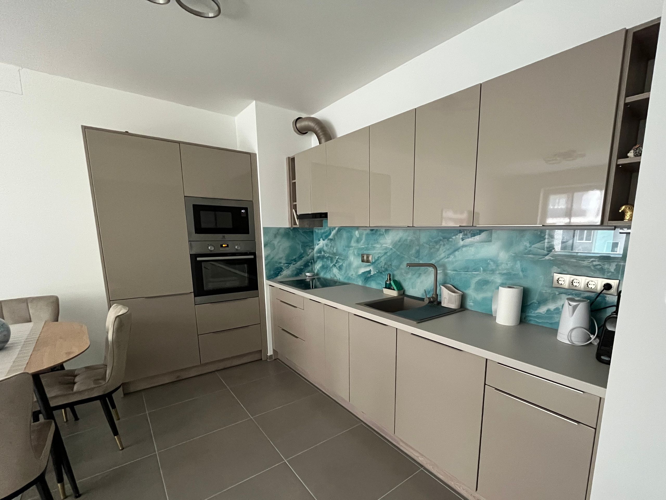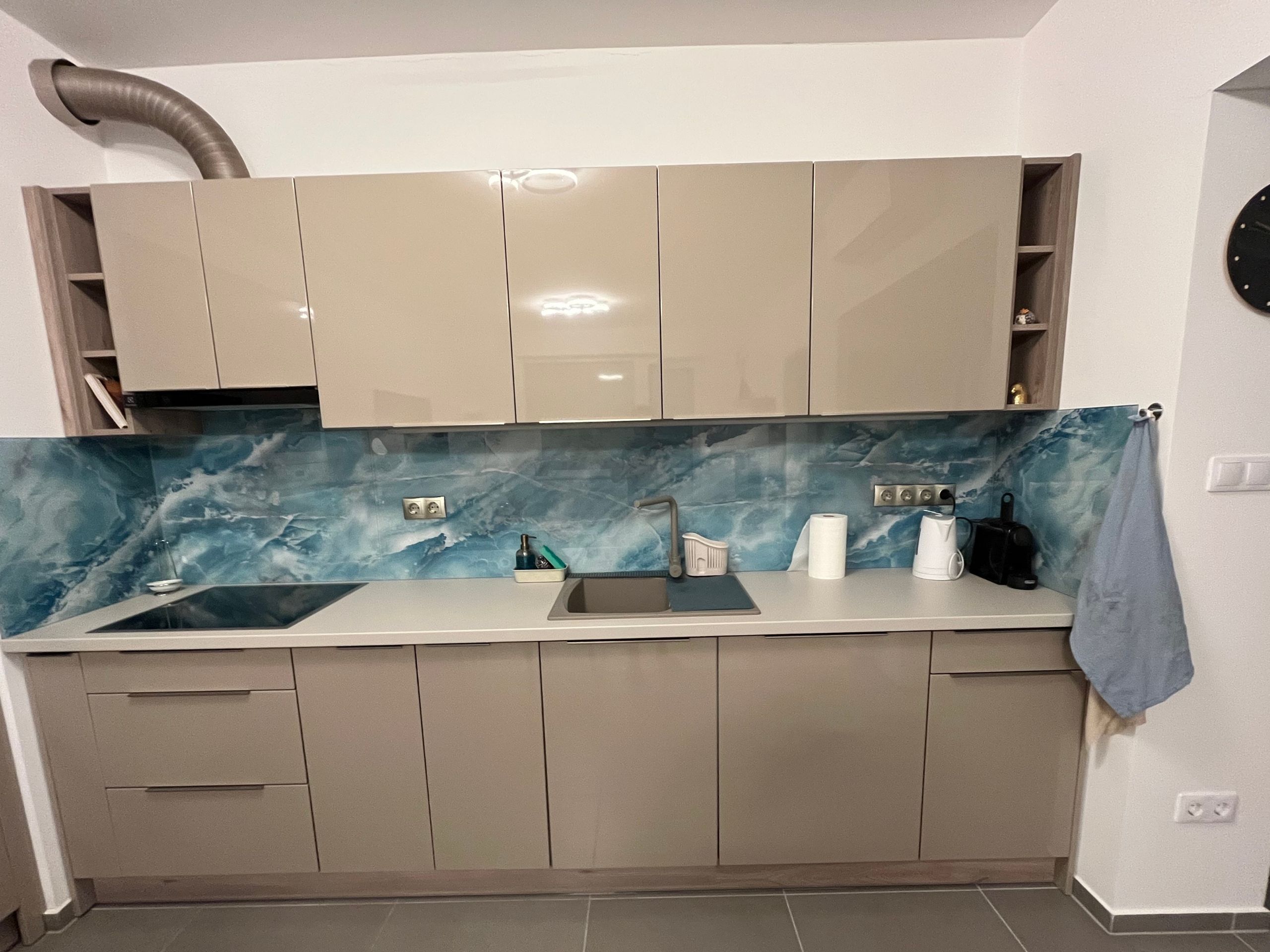 Bal oldalon két álló elem kapott helyet, beépített hűtő és álló sütős-mikrós elem, amibe beépített mikró került. A hosszabb oldalon 15-ös kihúzható fűszeressel kezdtük, hogy ne a falon legyen a főzőlap, legyen egy kis hely, kényelmesebb legyen. A mosogató tálca Elleci gránit mosogató, tortoga színben, ami nagyon jól harmonizál a fronthoz és a munkalaphoz is, ami Egger U702-es lett. A mosogató alatt 50-es Blanco szelektív hulladékgyűjtő kapott helyet.A felső elemsorban, hogy egy kis szimetriát belevigyünk 15-ös elemmel indul és végződik a sorunk. Fogantyúnál minél rejtettebbet szerettek volna, így esett a választás a szálcsiszolt  Lucata fogantyúra, ami eleganciát kölcsönöz a bútornak.