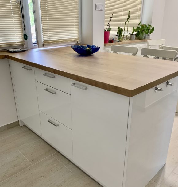 Szeretett volna mindenképp egy szigetet, hogy egy gyors reggelizéshez ne kelljen az étkezőrészt használni, illetve ki tudja használni a plusz munkapult lehetőséget is.