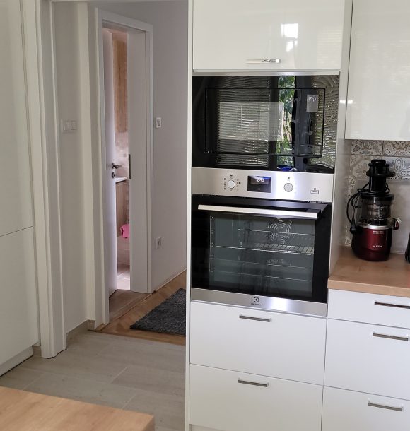 A konyhatervezés elején megvoltak a biztos igények, amiket mindenképpen szeretett volna megrendelőnk, így ezeket szem előtt tartva, próbáltuk a legjobbat kihozni. A sütő-mikró álló elembe került, hogy a sütőhöz ne kelljen lehajolni, minél több fiókos elem legyen, mert könnyebben átláthatóbb, mint az ajtós verziónál. A sarokelem, hogy minél jobban kihasználható legyen 4 tálcás rácsos vasalat került bele. A mosogató alá Blanco szelektív kuka kapott helyett, a mosogató és a csaptelep pedig az Elleci márkából került kiválasztásra. A főzőlap utáni utolsó elem egy kis kihúzható fűszeres lett, hogy legyen egy pici munkalap rész még a falig, így kényelmesebb.