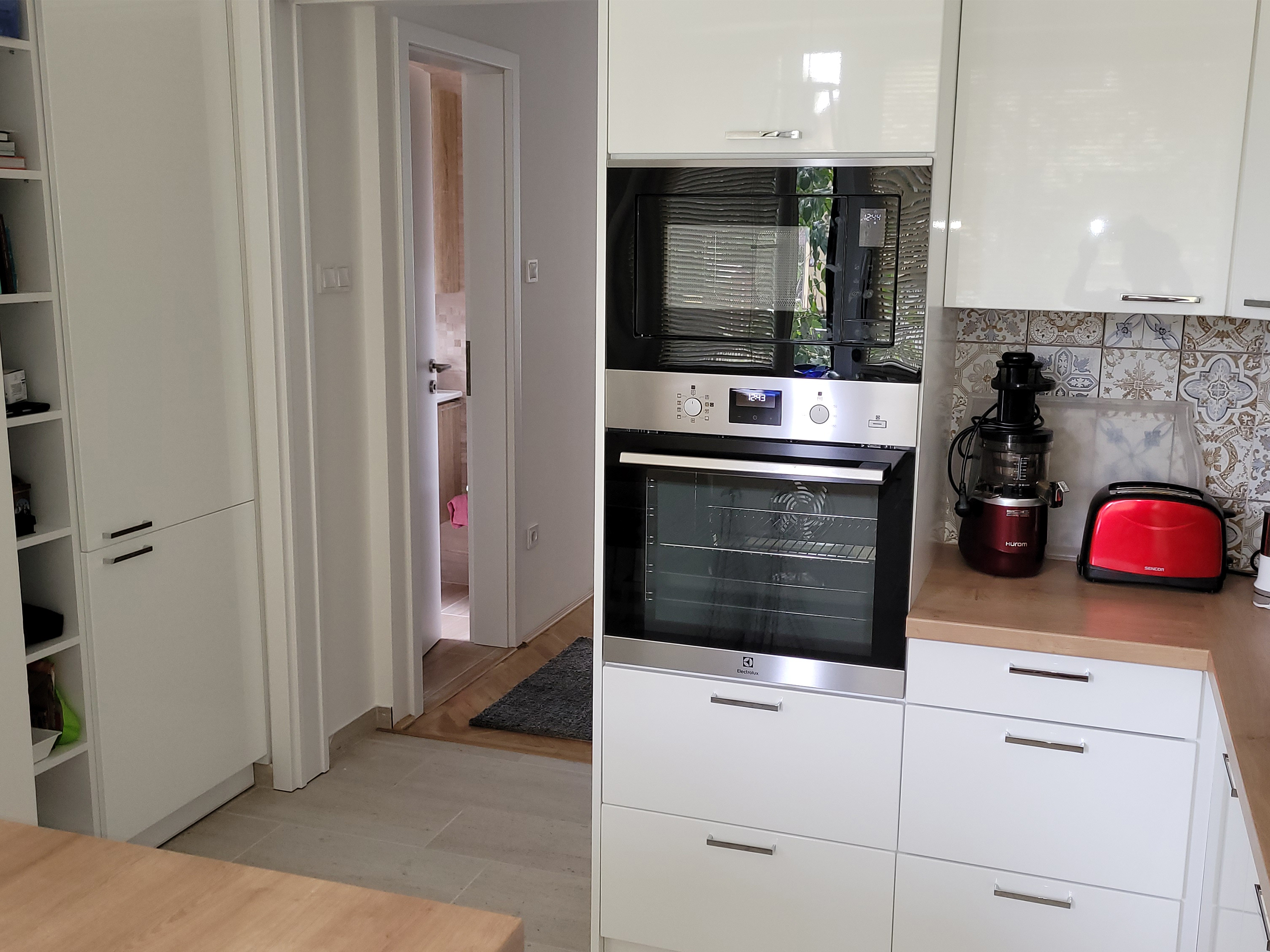 A konyhatervezés elején megvoltak a biztos igények, amiket mindenképpen szeretett volna megrendelőnk, így ezeket szem előtt tartva, próbáltuk a legjobbat kihozni. A sütő-mikró álló elembe került, hogy a sütőhöz ne kelljen lehajolni, minél több fiókos elem legyen, mert könnyebben átláthatóbb, mint az ajtós verziónál. A sarokelem, hogy minél jobban kihasználható legyen 4 tálcás rácsos vasalat került bele. A mosogató alá Blanco szelektív kuka kapott helyett, a mosogató és a csaptelep pedig az Elleci márkából került kiválasztásra. A főzőlap utáni utolsó elem egy kis kihúzható fűszeres lett, hogy legyen egy pici munkalap rész még a falig, így kényelmesebb.